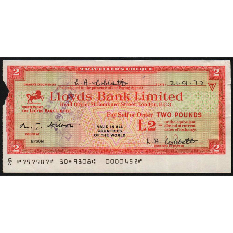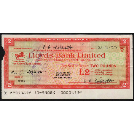 Grande-Bretagne - Chèque Voyage - Lloyds - 2 pounds - 1972 - Etat : TB-