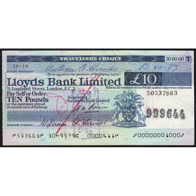 Grande-Bretagne - Chèque Voyage - Lloyds - 10 pounds - 1973 - Etat : SUP