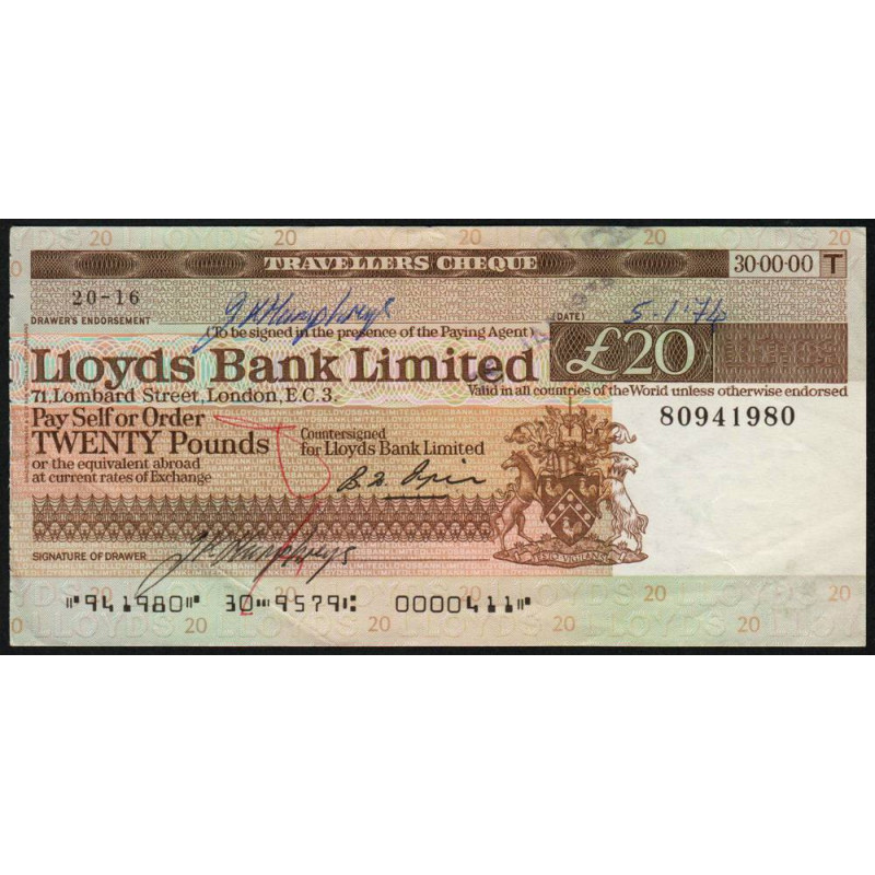 Grande-Bretagne - Chèque Voyage - Lloyds - 20 pounds - 1974 - Etat : TTB+