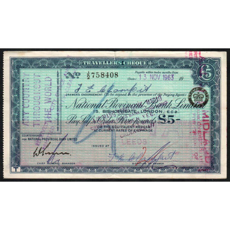 Grande-Bretagne - Chèque Voyage - National Provincial - 5 pounds - 1963 - Etat : TTB