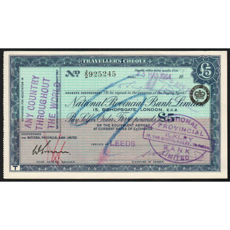 Grande-Bretagne - Chèque Voyage - National Provincial - 5 pounds - 1964 - Etat : SPL