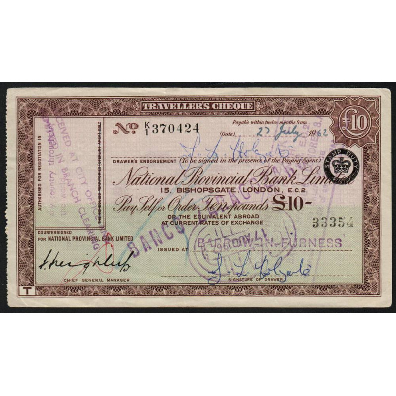 Grande-Bretagne - Chèque Voyage - National Provincial - 10 pounds - 1962 - Etat : TTB