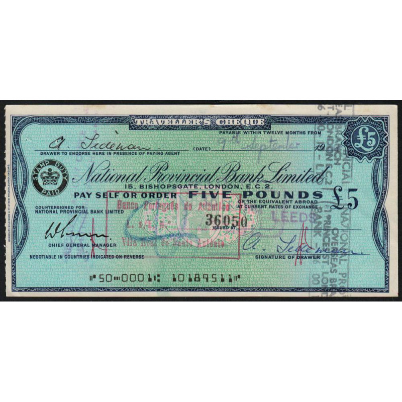 Grande-Bretagne - Chèque Voyage - National Provincial - 5 pounds - 1964 - Etat : TTB+