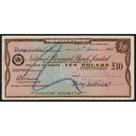 Grande-Bretagne - Chèque Voyage - National Provincial - 10 pounds - 1965 - Etat : SUP