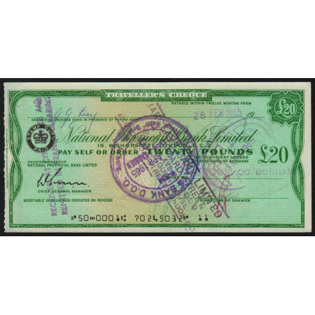 Grande-Bretagne - Afrique du Sud - Chèque Voyage - National Provincial - 20 pounds - 1965 - Etat : SUP+