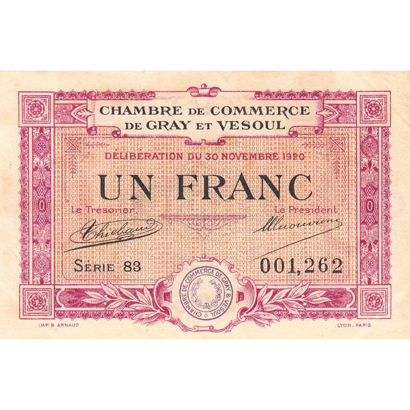 Gray & Vesoul - Pirot 62-17 - 1 franc - Série 83 - 1920 - Etat : TTB