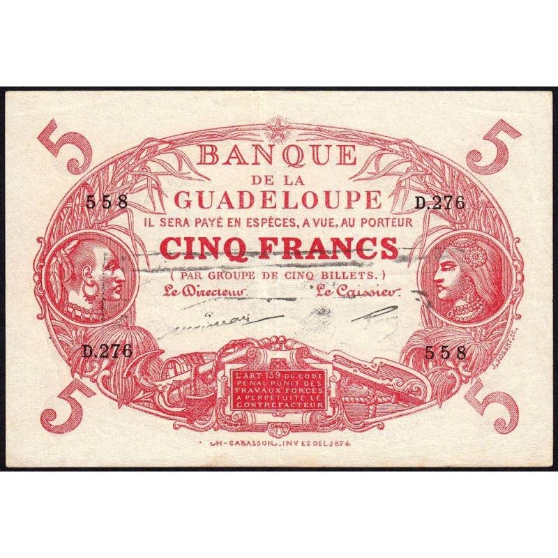 • Guadeloupe - Pick 7q - 5 francs - Série D.276 - 1944 - Etat : TTB+