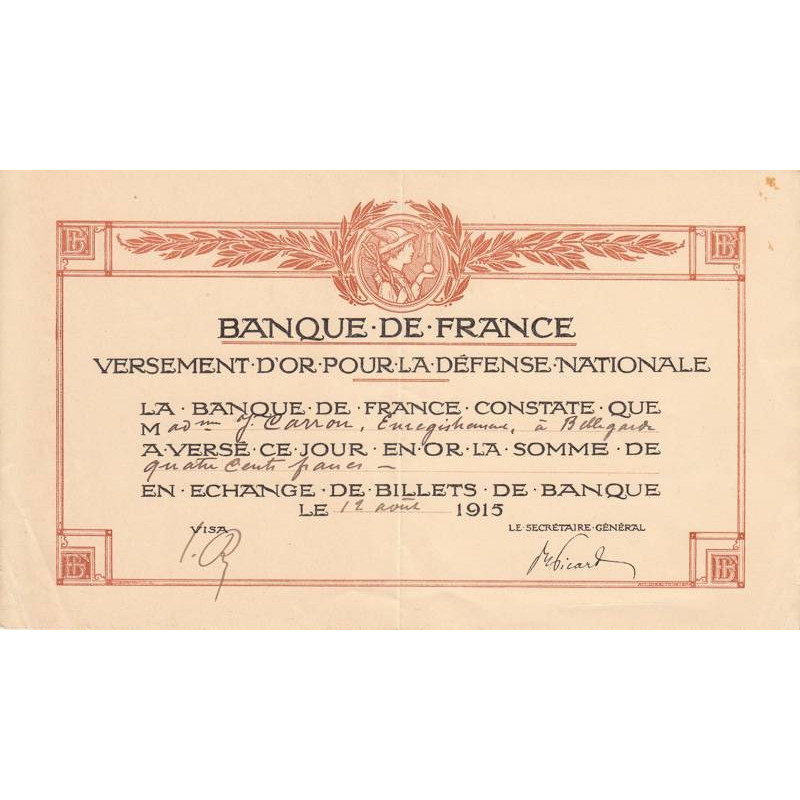 01 - Bellegarde - Versement d'or pour la Défense Nationale - 1915 - Etat : TTB+