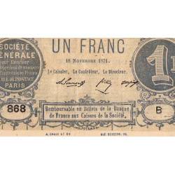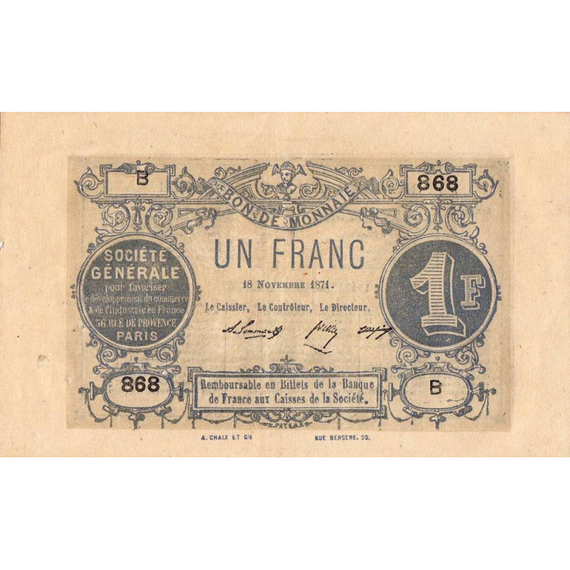 Paris - Société Générale - Jer 75.02A - 1 franc - Série B - 18/11/1871 - Etat : TTB+