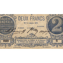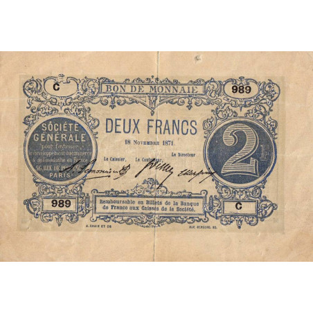 Paris - Société Générale - Jer 75.02B - 2 francs - Série C - 18/11/1871 - Etat : TTB