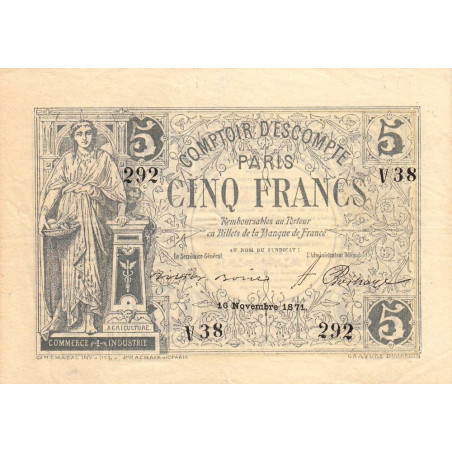 Paris - Comptoir d'Escompte - Jer 75.03A - 5 francs - Série V.38 - 16/11/1871 - Etat : TTB+