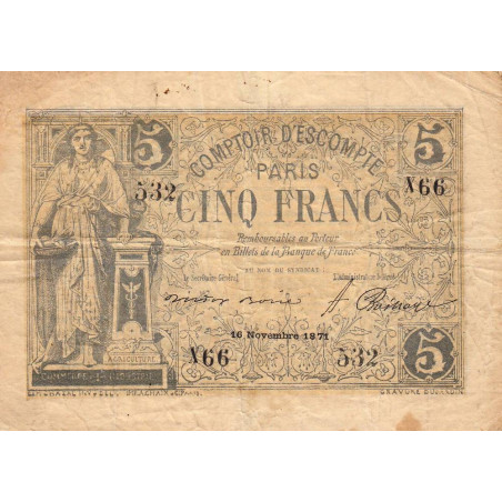 Paris - Comptoir d'Escompte - Jer 75.03A - 5 francs - Série X.66 - 16/11/1871 - Etat : TB