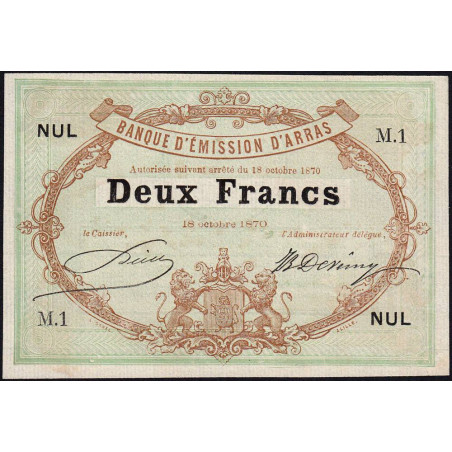 B. d'émission Arras - Jer 62.02A - 2 francs - Série M.1 - 18/10/1870 - Etat : SPL