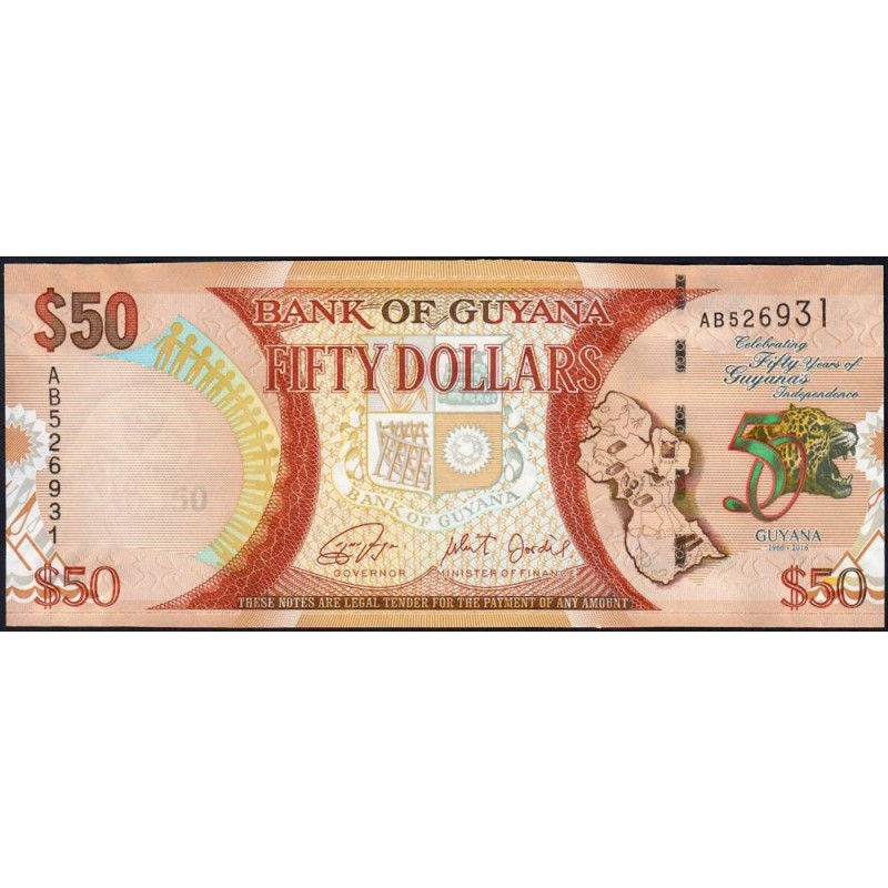 Avers : Logo de la Banque, carte du Guyana, logo du 50e anniversaire et tête de jaguar