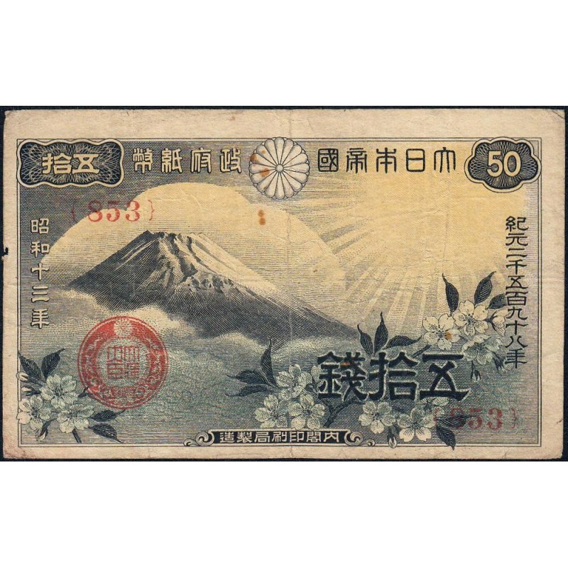 Avers : Sceau impérial à 16 pétales doubles (chrysanthème), soleil sur le Mont Fuji, branche de cerisier avec des fleurs