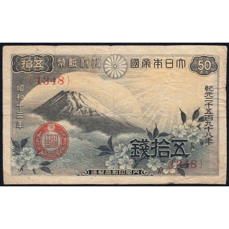 Avers : Sceau impérial à 16 pétales doubles (chrysanthème), soleil sur le Mont Fuji, branche de cerisier avec des fleurs