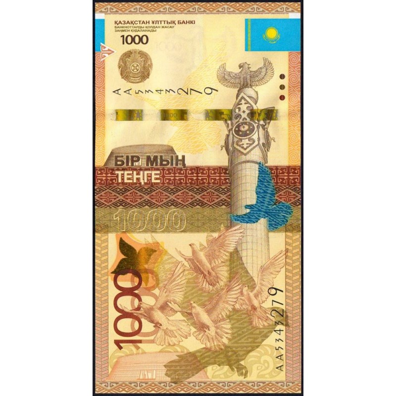 Avers : Monument Kazakh Eli (Pays Kazakh) avec l'oiseau mythique Samruk à son sommet situé sur la place de l'Indépendance d'Astana, colombes en vol, emblème circulaire du pays