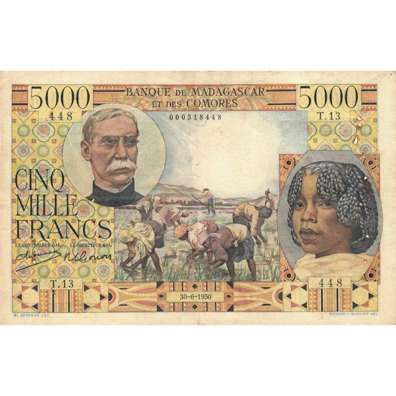 Avers : Médaillon rond avec le portait du général Joseph Gallieni (gouverneur général de Madagascar de 1896 à 1905), médaillon ovale avec le portrait d'une jeune fille Bara, au centre travail dans une rizière