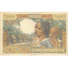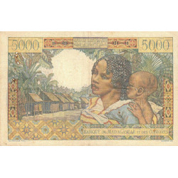 Revers : Femme Sakalava portant son bébé sur le dos, village côtier du centre-ouest avec palmiers et ravinala (arbre du voyageur)
