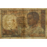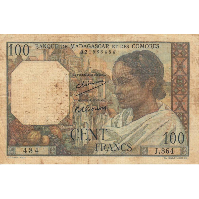 Avers : Femme Merina avec son lamba blanc sur les épaules et tresses traditionelle, scène de marché avec fruits, palais de la reine à Antananarivo