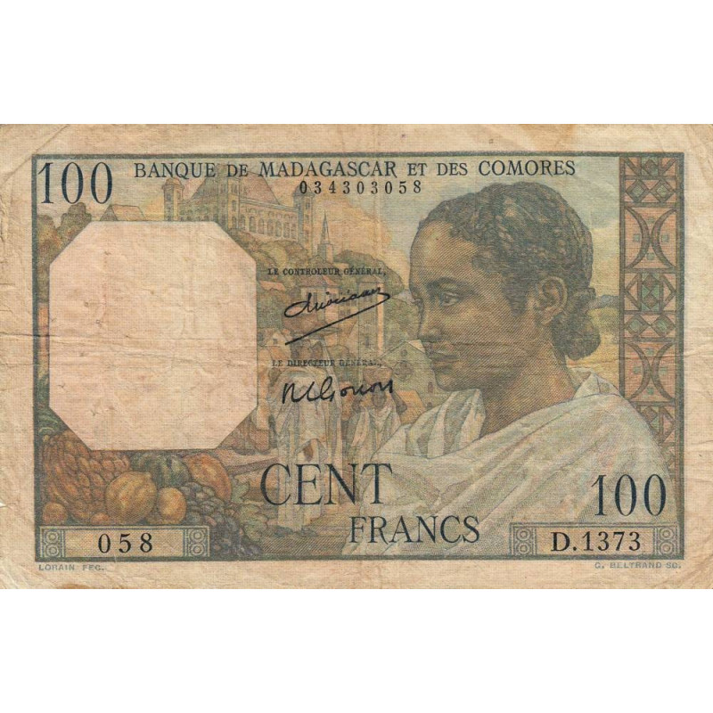 Avers : Femme Merina avec son lamba blanc sur les épaules et tresses traditionelle, scène de marché avec fruits, palais de la reine à Antananarivo