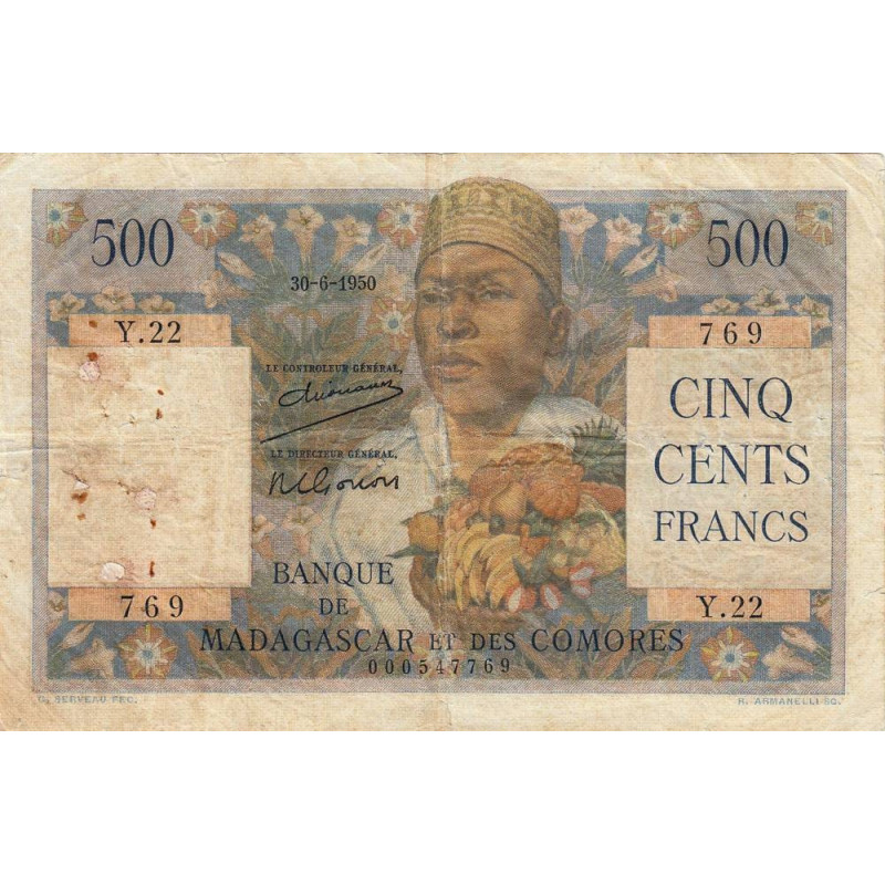 Avers : Jeune comorien coiffé du traditionnel Kofia avec une grande corbeille de fruits locaux devant lui