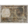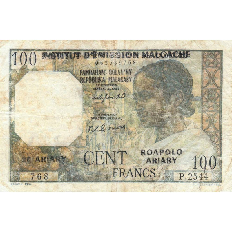 Avers : Femme Merina avec son lamba blanc sur les épaules et tresses traditionelle, scène de marché avec fruits, palais de la reine à Antananarivo