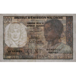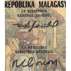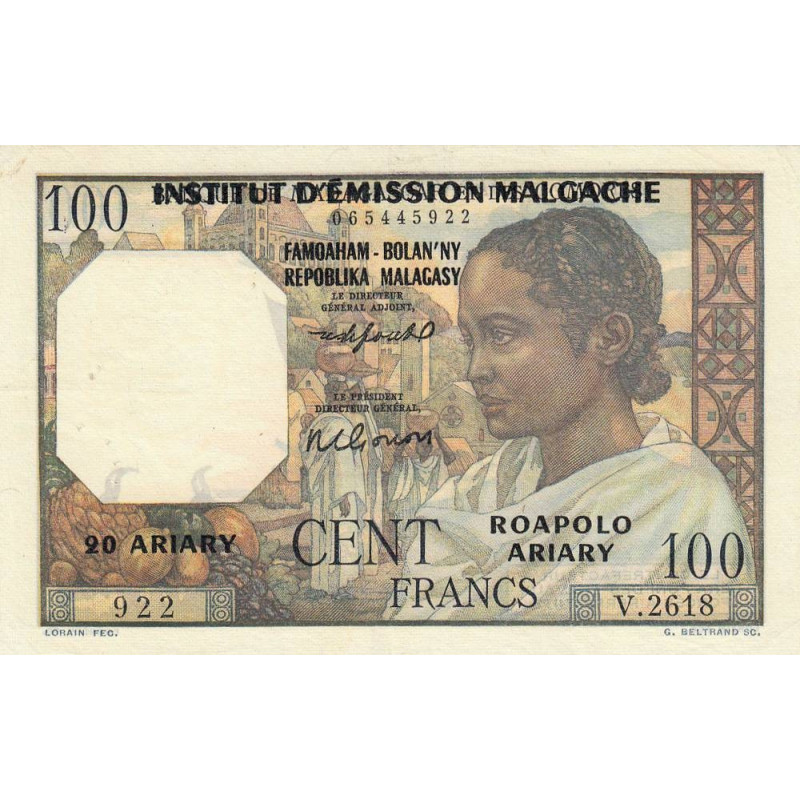 Avers : Femme Merina avec son lamba blanc sur les épaules et tresses traditionelle, scène de marché avec fruits, palais de la reine à Antananarivo