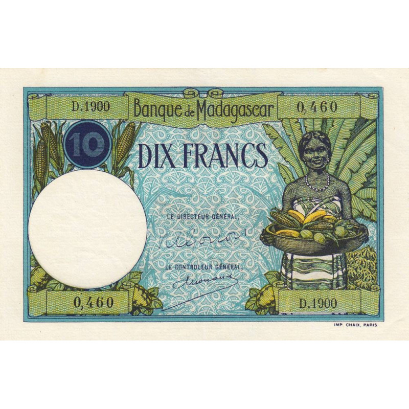 Avers : Femme malgache tenant un panier rempli de fruits et de légumes, tiges de maïs et bananier