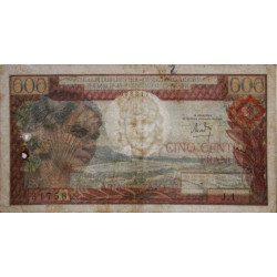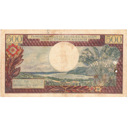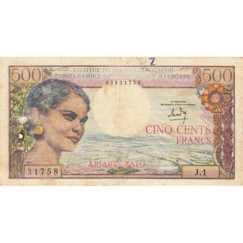 • Madagascar - Pick 58a - 500 francs - 100 ariary - Série J.1 - 1964 - Etat : B