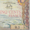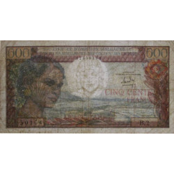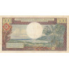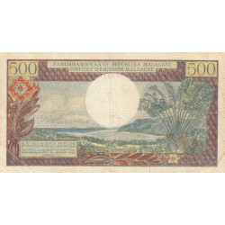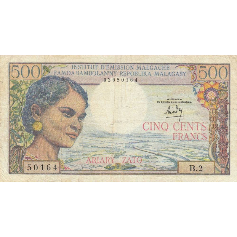 Avers : A gauche portrait d'une femme malgache, paysage des hauts-plateaux avec rizières et habitations en arrière-plan, à droite deux aloalo (poteau funéraire traditionnel richement sculpté)