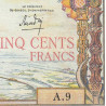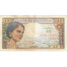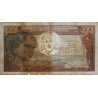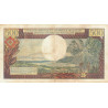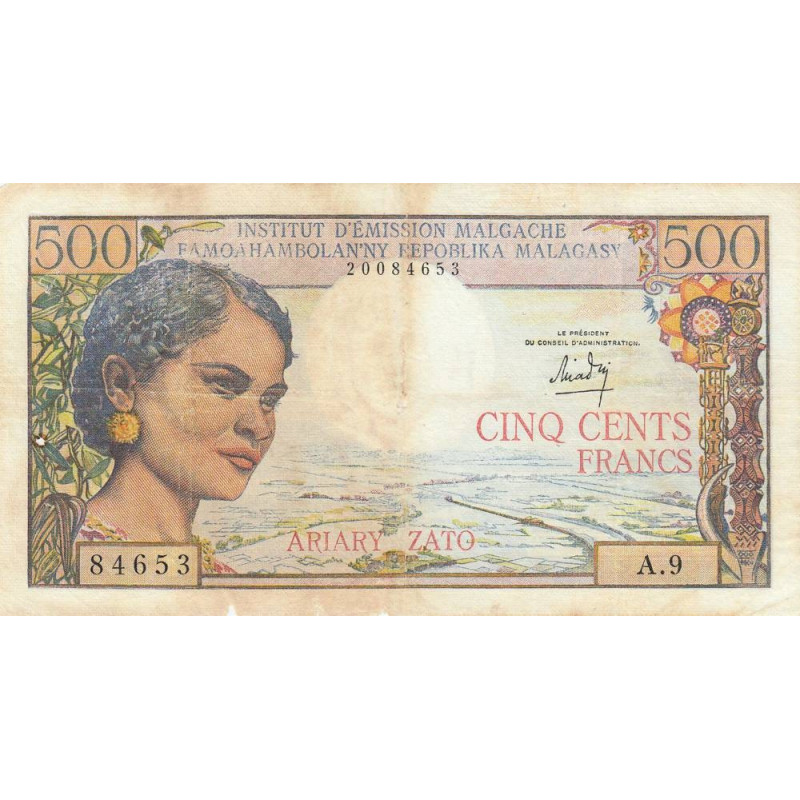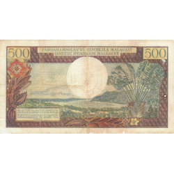 Avers : A gauche portrait d'une femme malgache, paysage des hauts-plateaux avec rizières et habitations en arrière-plan, à droite deux aloalo (poteau funéraire traditionnel richement sculpté)
