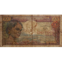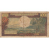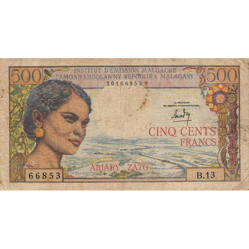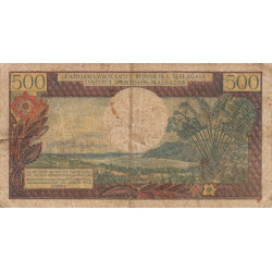 Avers : A gauche portrait d'une femme malgache, paysage des hauts-plateaux avec rizières et habitations en arrière-plan, à droite deux aloalo (poteau funéraire traditionnel richement sculpté)