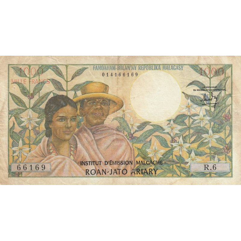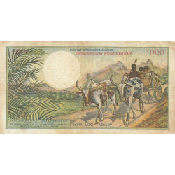 Revers : Trois personnes sur une charette tirée par des zébus dans un paysage des hauts plateaux