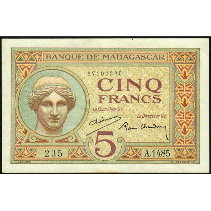 • Madagascar - Pick 35b - 5 francs - Série A.1485 - 1937 - Etat : TTB+
