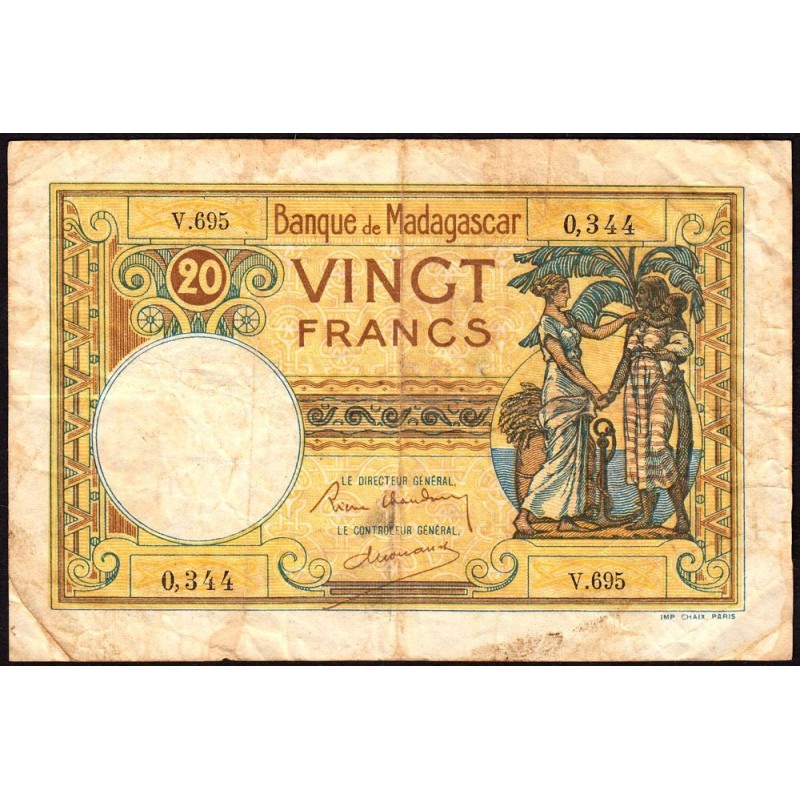 • Madagascar - Pick 37b - 20 francs - Série V.695 - 1937 - Etat : B+