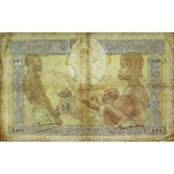 Revers : Paysan Betsileo en habit traditionnel des hauts plateaux conduisant son attelage de zébus en tenant un baton, en arrière-plan un long attelage de zébus, à droite et à gauche poteau aloalo (poteau funéraire traditionnel)