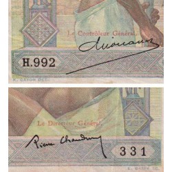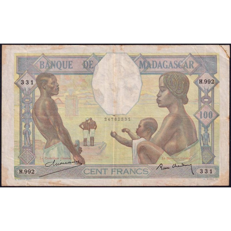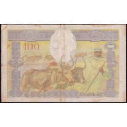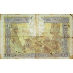 Revers : Paysan Betsileo en habit traditionnel des hauts plateaux conduisant son attelage de zébus en tenant un baton, en arrière-plan un long attelage de zébus, à droite et à gauche poteau aloalo (poteau funéraire traditionnel)
