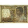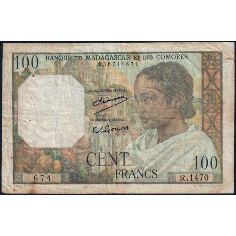 Avers : Femme Merina avec son lamba blanc sur les épaules et tresses traditionelle, scène de marché avec fruits, palais de la reine à Antananarivo