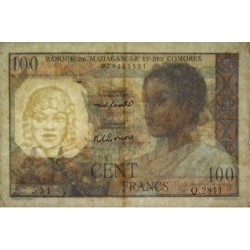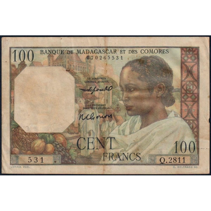 Avers : Femme Merina avec son lamba blanc sur les épaules et tresses traditionelle, scène de marché avec fruits, palais de la reine à Antananarivo