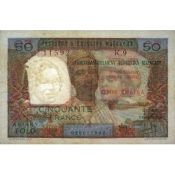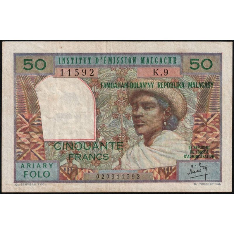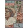 Avers : Portrait d'une femme betsileo portant son lamba traditionnel et son chapeau en paille, fleurs au centre