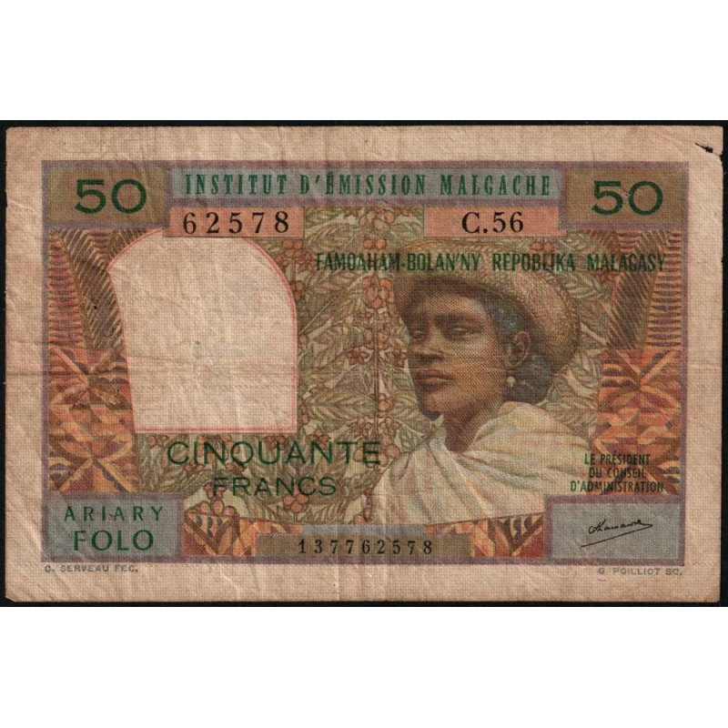Avers : Portrait d'une femme betsileo portant son lamba traditionnel et son chapeau en paille, fleurs au centre