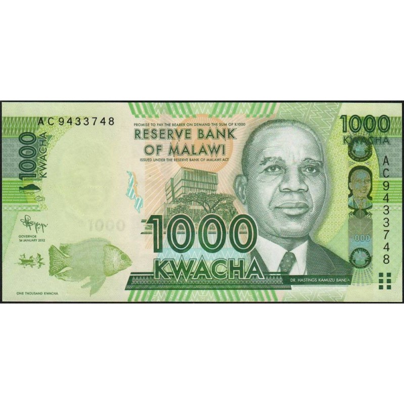 Avers : Portrait du Dr Hastings Kamuzu Banda (1898-1997) président de 1966 à 1994, poisson, bâtiment de la Banque Centrale à Lilongwe