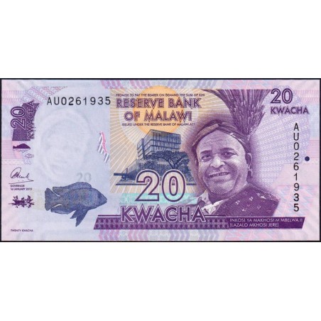 Avers : Portrait de Inkosi ya Makhosi chef de la dynastie Jere de 1928 à 1959, poisson, bâtiment de la Banque Centrale à Lilongwe