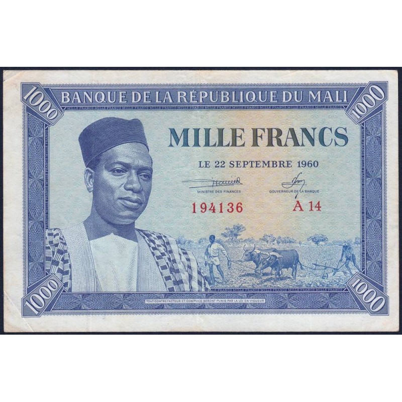 Avers : Portrait de Modibo Keïta (1915-1977) président de la république de 1960 à 1968, deux paysans labourant un champ à l'aide d'une charrue tirée par deux boeufs