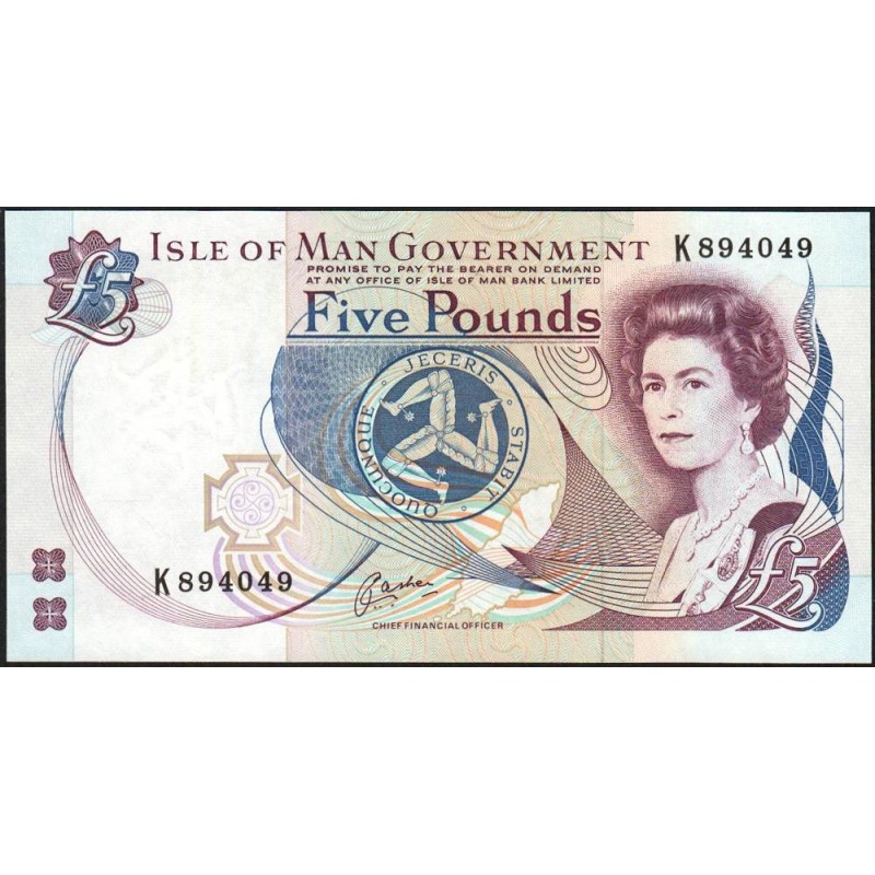 Avers : Portrait d'Elizabeth II (1926-2022) reine du Royaume-Uni et du Commonwealth britannique de 1952 à 2022, triskèle emblème de l'île