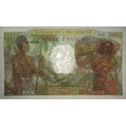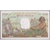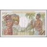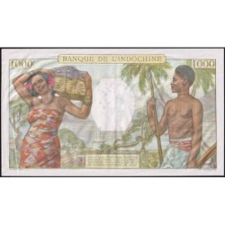 Revers : Jeune femme polynésienne avec des fleurs dans les cheveux portant un panier sur l'épaule, jeune homme tenant une lance, en arrière-plan maisons au bord du rivage, palmiers, bateau