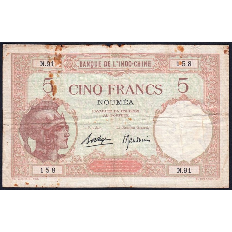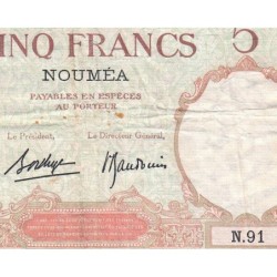 • Nouvelle-Calédonie - Nouméa - Pick 36b_2 - 5 francs - Série N.91 - 1937 - Etat : B à B+