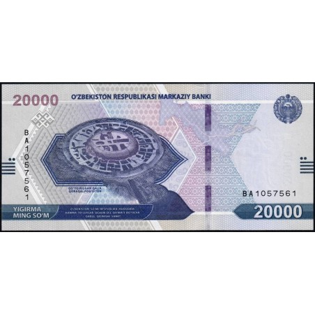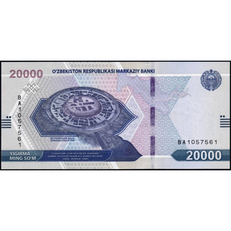 Avers : Emblème du pays, forteresse de Koi Krylgan Kala à proximité de Turtkul dans la région d'Ellikkala (république autonome du Karakalpakstan), route des caravannes sur la carte de l'Ouzbékistan,