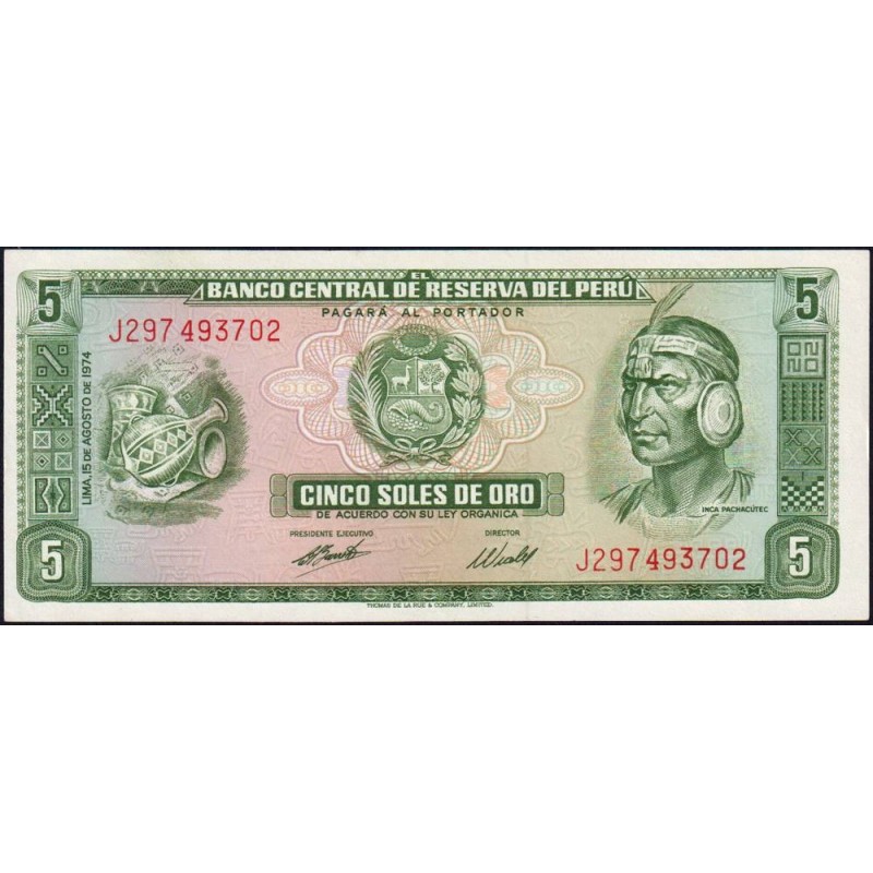 Avers : A gauche anciennes poteries traditionnelles, au centre emblème du pays, à droite portrait du chef inca Pachacútec (1400-1471) premier empereur de l'empire inca de 1438 à 1471